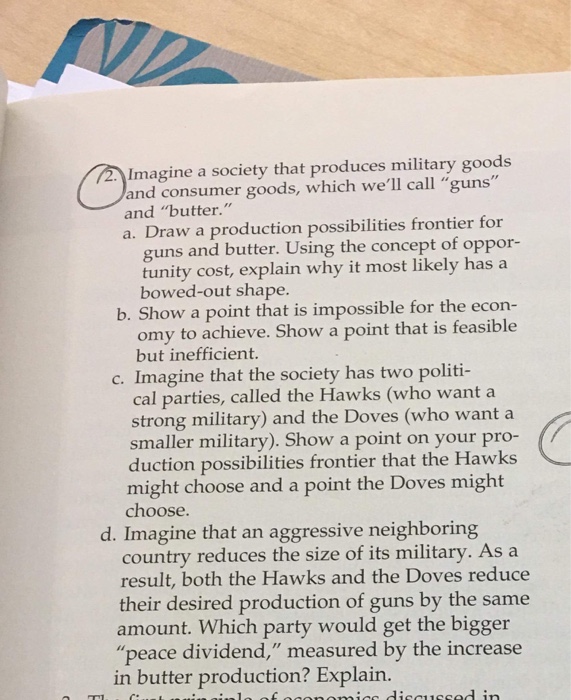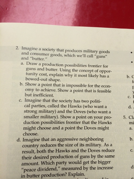 Imagine a society that produces military goods and consumer goods called guns and butter respectively. Imagine a society that produces military goods and consumer goods which well call guns and butter a. Suppose the society has two political parties the Hawks that want a strong military but still some consumer goods and the Doves that want a.
